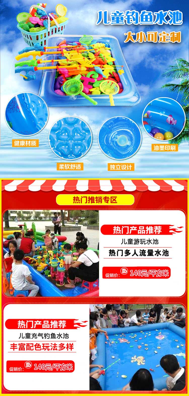 簡介:充氣水池釣魚是兒童游玩的一種新型模式,采用PVC材料制作而成的充氣水池,兒童釣魚充氣水池大小可根據場地定制,里面放一些小金魚,方便簡單。 圓形釣魚充氣水池 方形釣魚充氣水池 多色釣魚充氣水池 小型釣魚充氣水池 圓形釣魚充氣水池 使用場景:廣場、公園、商場、游樂園、幼兒園、陸地等。